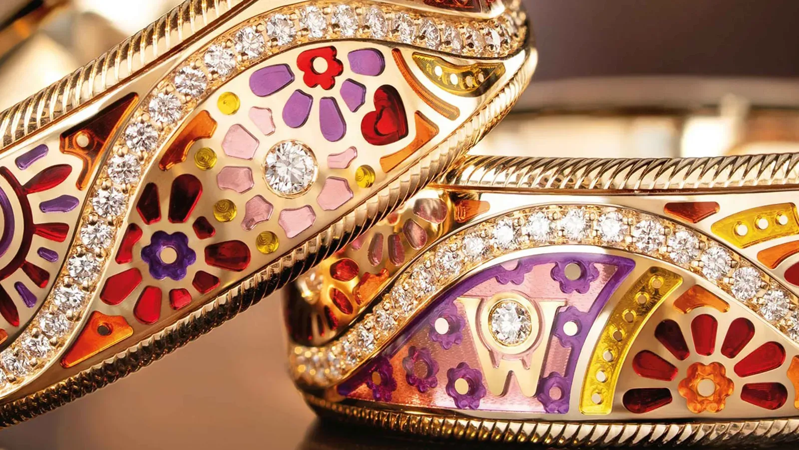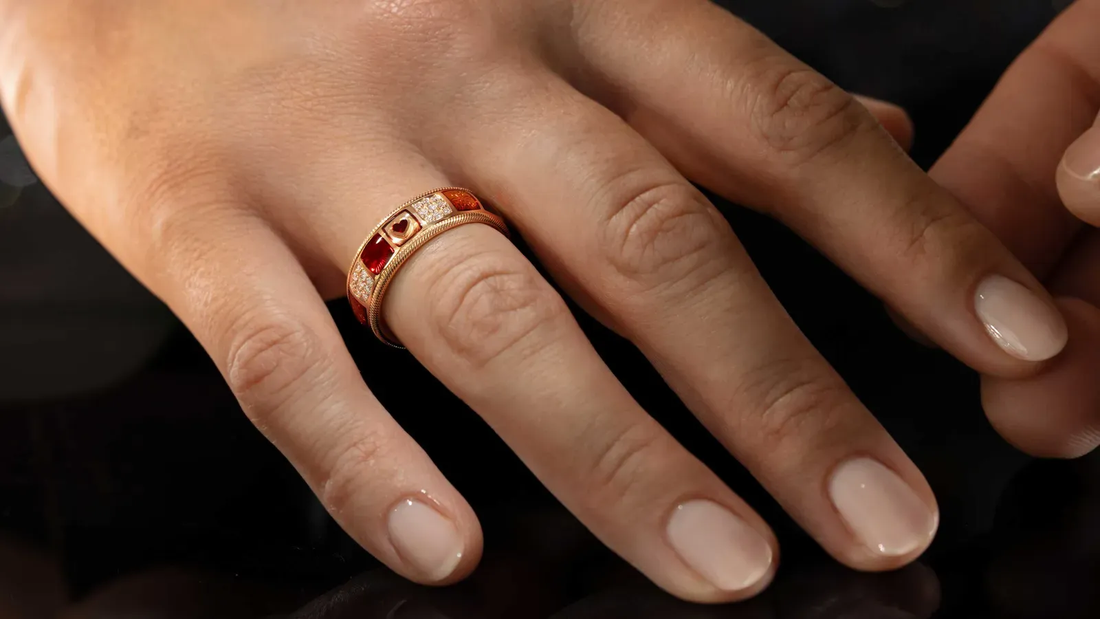 Im Untergrund gravierte Sonnenstrahlen, 46 funkelnde Brillanten und ein überemailliertes Herz als verborgene Signatur.