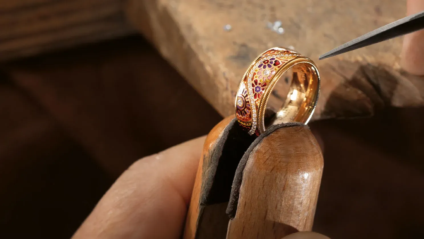 Mehrschichtige Kaltemaille in opaken und transparenten Farben, veredelt mit mikrofeinen Kristallpartikeln.