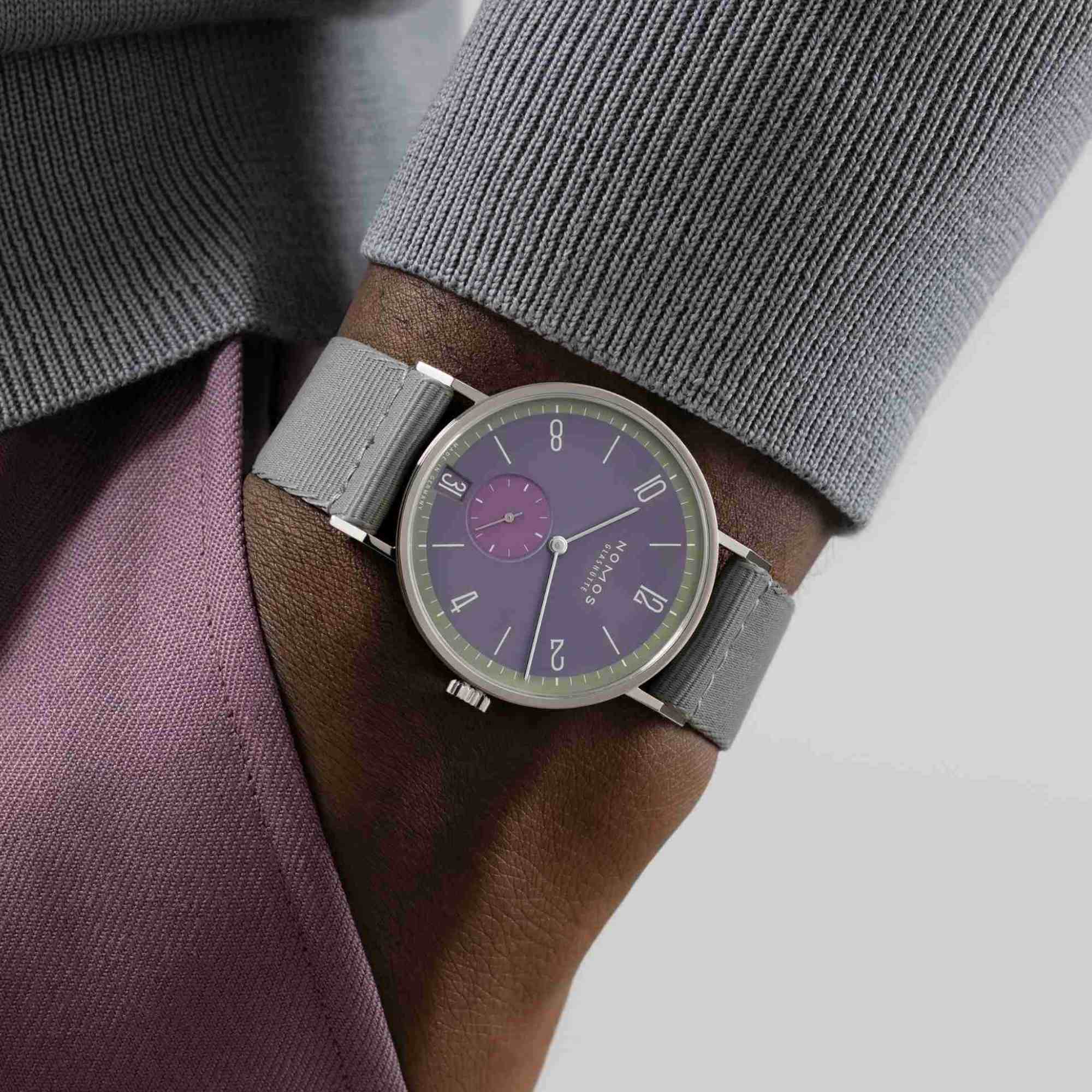 Minutenring grüngrau, Sekunde lila, Datumshintergrund viollet