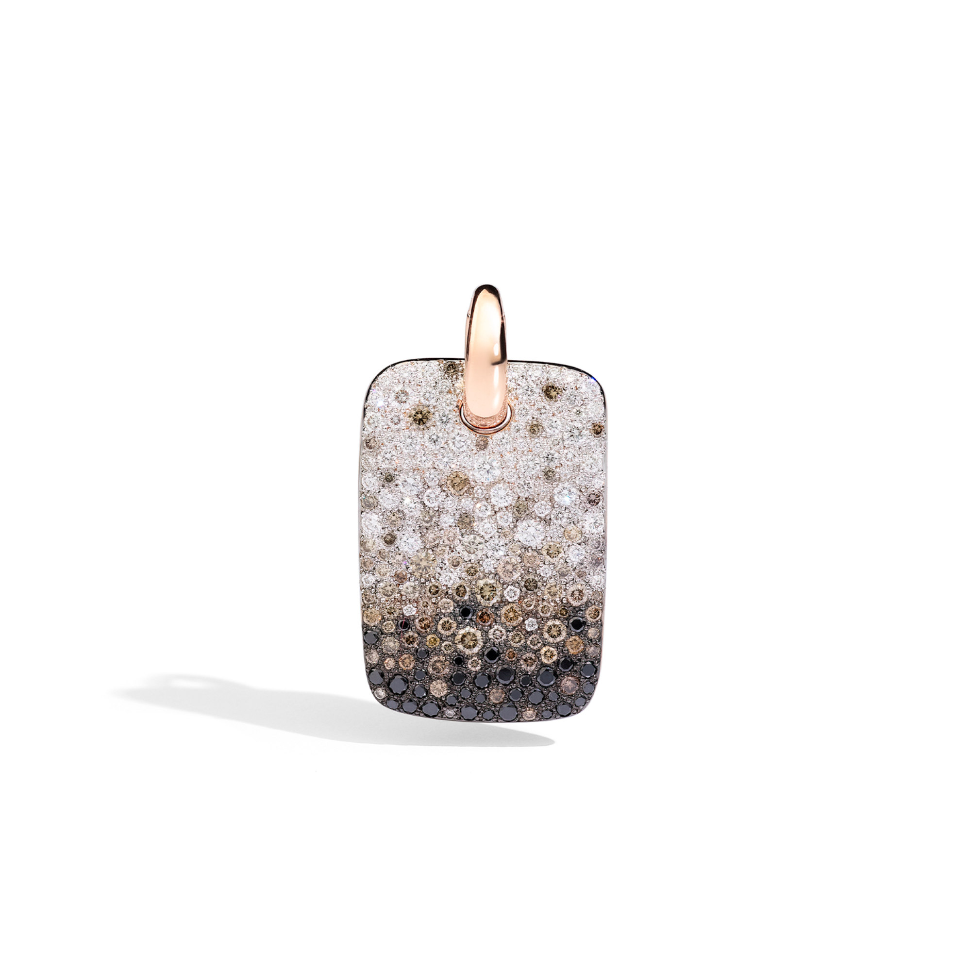Ref. PMC3080O7BWRDBX00 - Mit ihrer unkonventionellen Diamantfassung präsentieren Pomellatos Sabbia-Schmuckstücke die Meisterschaft der mailändischen Goldschmiedekunst. In einem reizvollen Farbverlauf von hell nach dunkel funkeln weiße, braune und schwarze Diamanten auf dem rechteckigen Anhänger in einer reichen und organischen Textur. Die akribische Liebe zum Detail zeigt sich in der besonderen Intensität, mit der die Diamanten schimmern. Selbst die Rückseite des Anhängers ist mit einem einzelnen weißen Diamanten verziert.