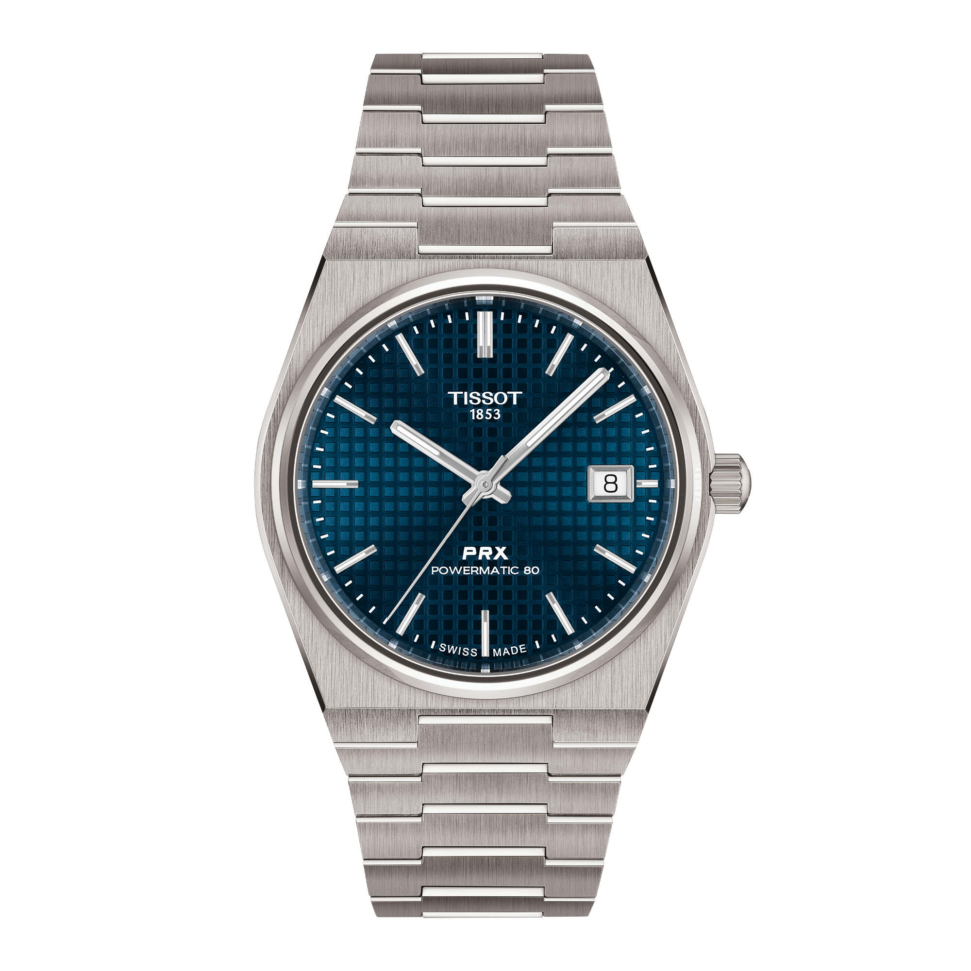 Komplettiert wird die Tissot PRX 38mm von einem flexiblen Titanarmband mit Butterfly-Faltschließe mit Drückern. Dank Schnellwechselsystem lässt es sich einfach und werkzeuglos austauschen.