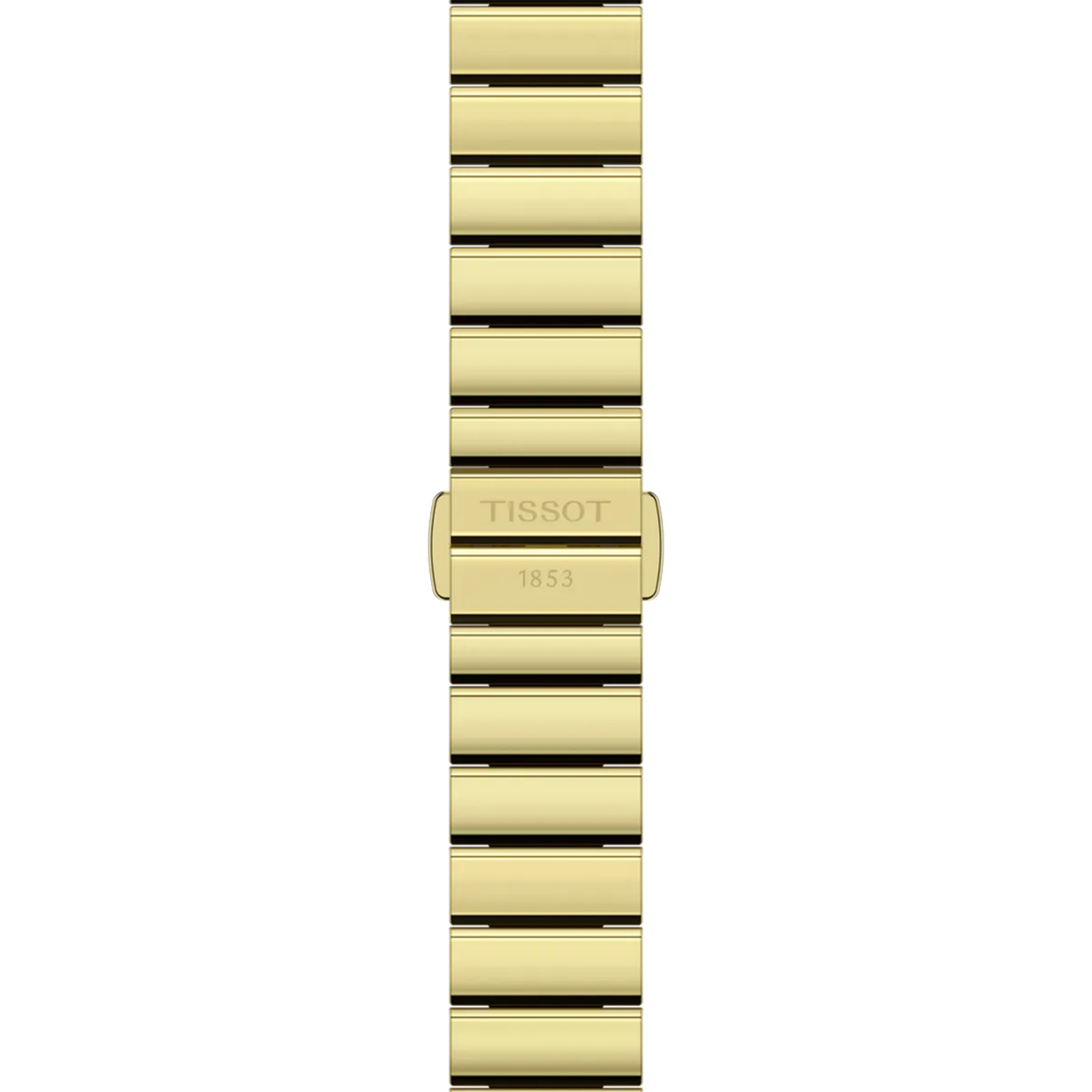 Diese Ausführung der Tissot SRV besitzt ein 316L-Edelstahlgehäuse und -armband mit gelbgoldfarbener PVD-Beschichtung sowie ein champagnerfarbenes Zifferblatt mit römischen Ziffern bei 12 und 6 Uhr.